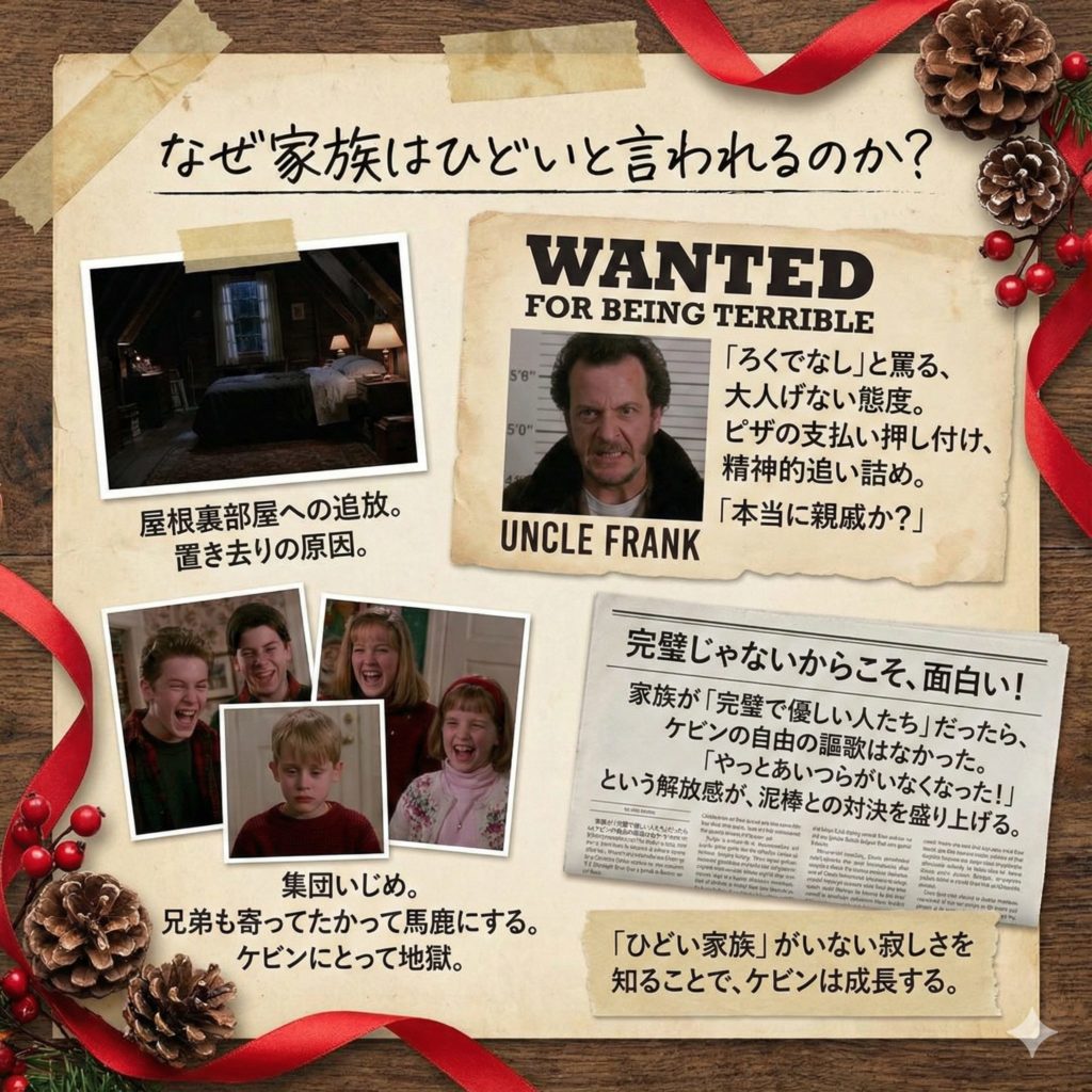 また、全員がケビンの言い分を聞こうとせず、彼を屋根裏部屋に追いやった結果、置き去りにしてしまったという事実も、視聴者に「ひどい家族」という印象を与えています。