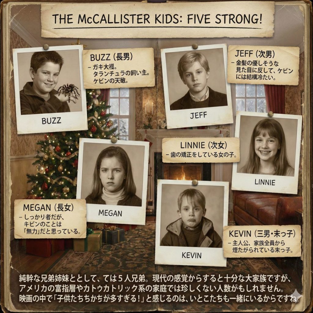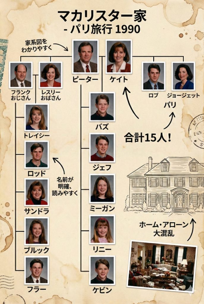 ここにパリ在住の親戚なども含めると、マカリスター一族はさらに大人数になりますが、映画のメイン舞台で描かれる「家族」としては、この14人(ケビンを入れると15人の集団)が基本となります。