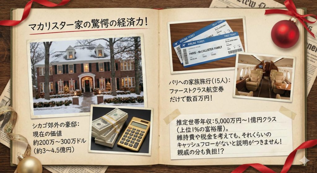 - 旅行の規模: クリスマスに家族総出でパリ(2作目ではフロリダ)へ旅行し、ファーストクラスを利用。