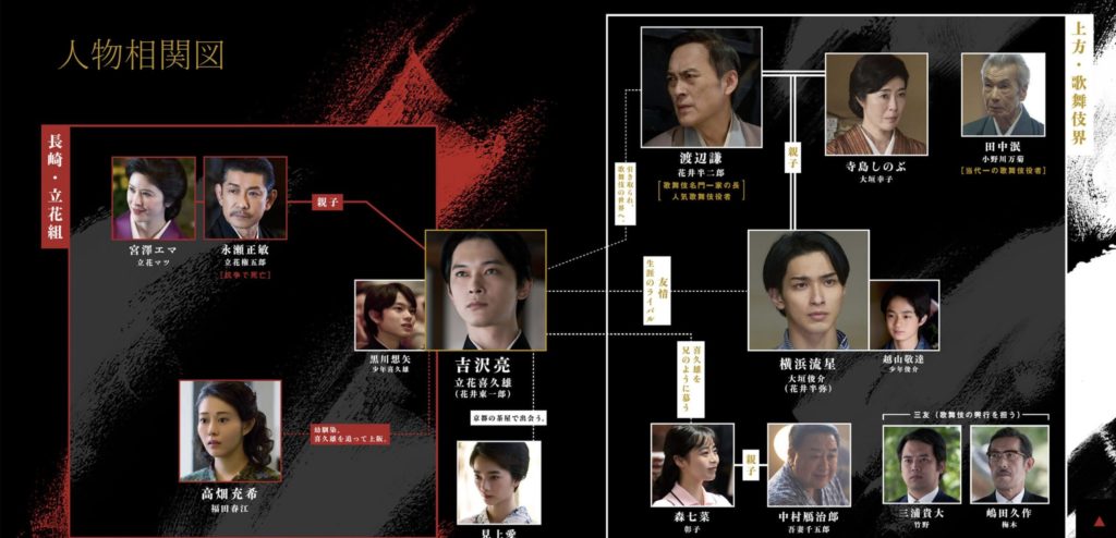 | 吉沢亮 | 立花喜久雄(花井東一郎) | 主人公。 任侠の一門に生まれるも、芸の才能を見出され歌舞伎の世界へ。 血筋のない世界で、稀代の女形として成り上がっていく。 |