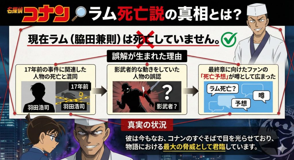 検索キーワードに「コナン ラム 死亡」と出てくることがありますが、現在ラム(脇田兼則)は死亡していません。 この誤解が生まれた理由はいくつか考えられます。