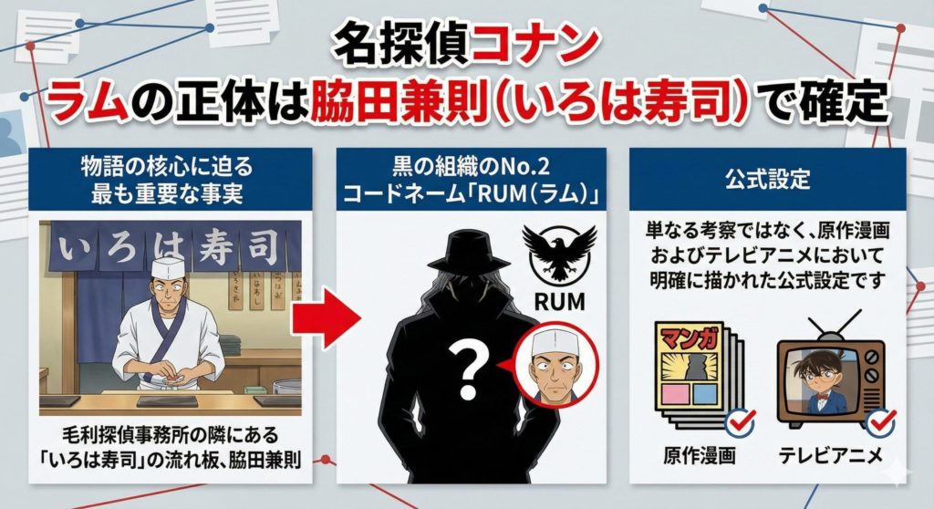 物語の核心に迫る最も重要な事実、それは黒の組織のNo.2であるコードネーム「RUM(ラム)」の正体が、毛利探偵事務所の隣にある「いろは寿司」の流れ板、脇田兼則(わきた かねのり)であるということです。 これは単なるファンによる考察ではなく、原作漫画およびテレビアニメにおいて明確に描かれた公式設定です。