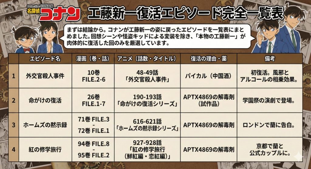 ここでは、回想シーンや怪盗キッドによる変装を除き、「本物の工藤新一」が肉体的に復活した回のみを厳選してまとめています。