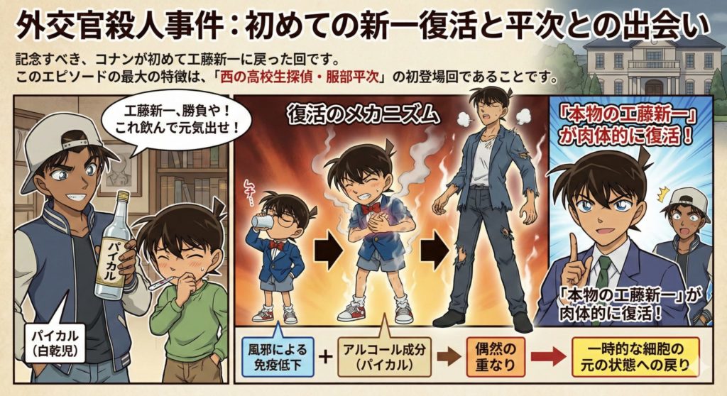 外交官殺人事件で初めて新一に戻る方法と平次との出会い