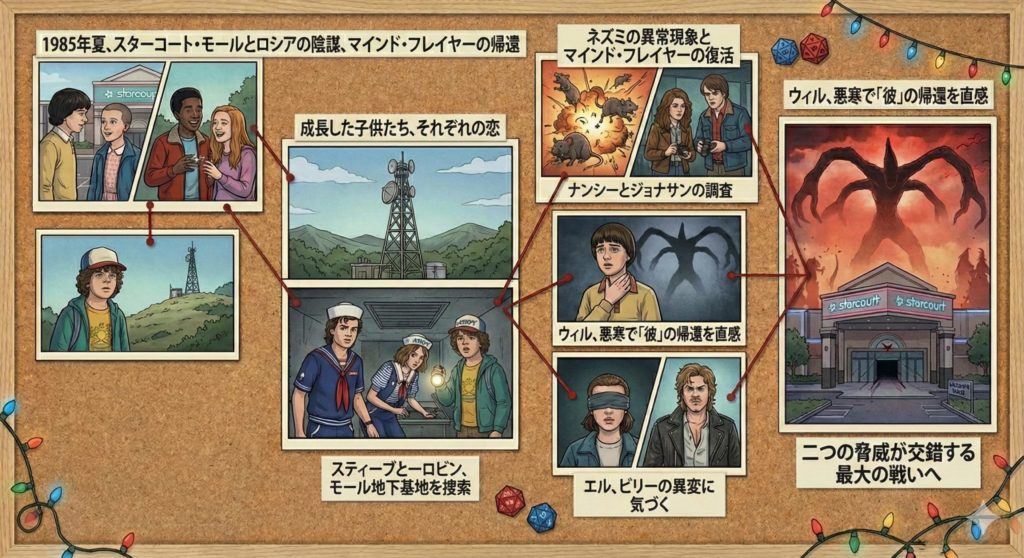 エルが自身のルーツを探り、仲間と共にゲートを閉じる物語。 - シーズン3: スターコート・モールに隠されたロシアの陰謀と、マインド・フレイヤーの逆襲。