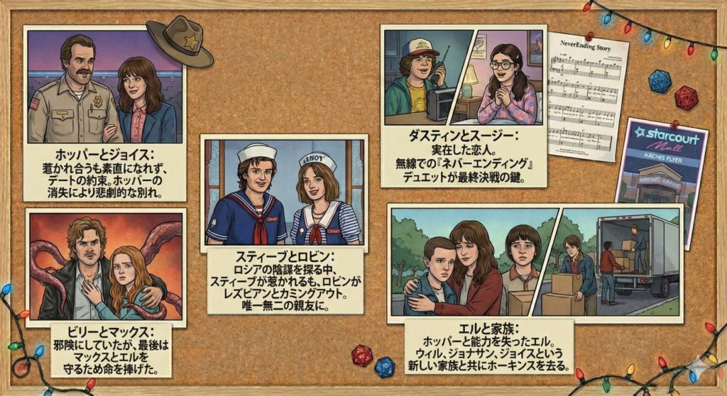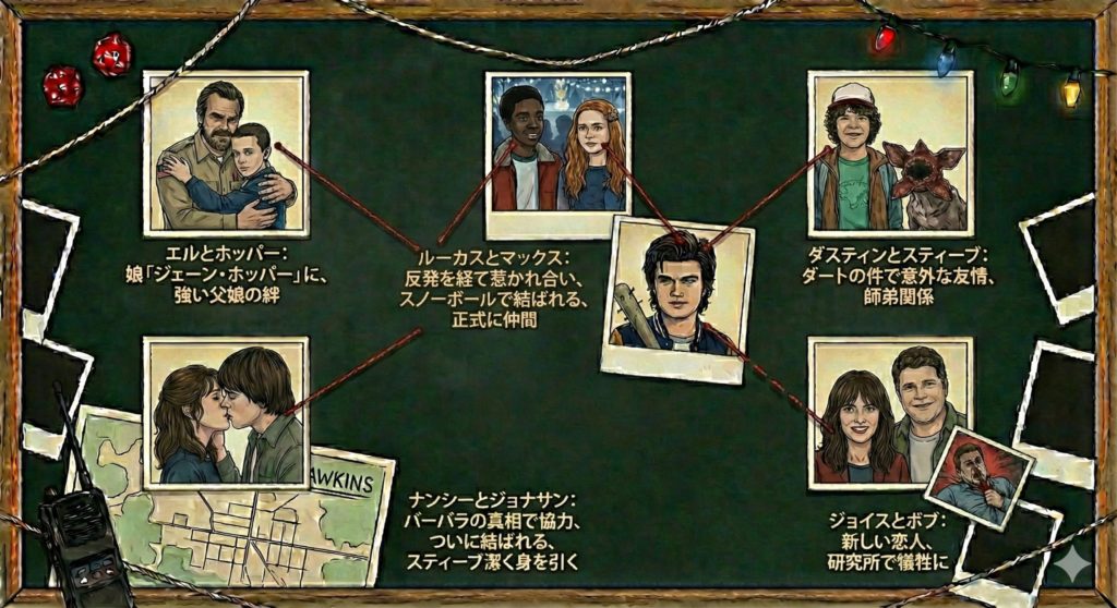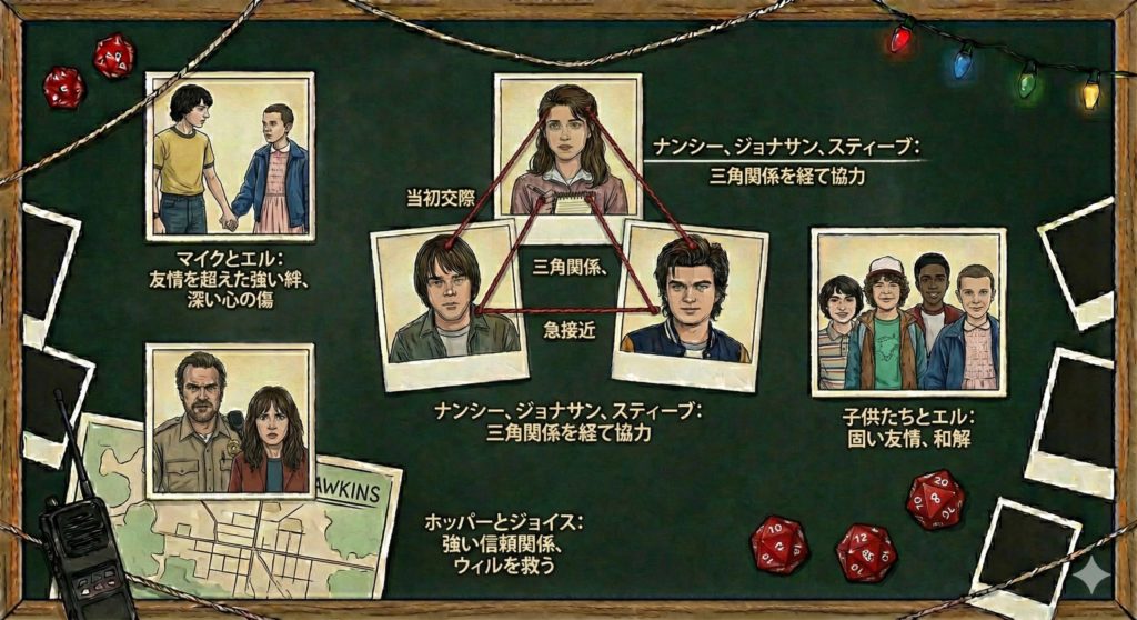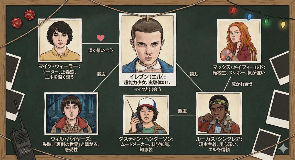 物語を深く理解するために、まずはホーキンスに住む主要なキャラクターたちと、彼らの基本的な関係性(相関図)を整理します。