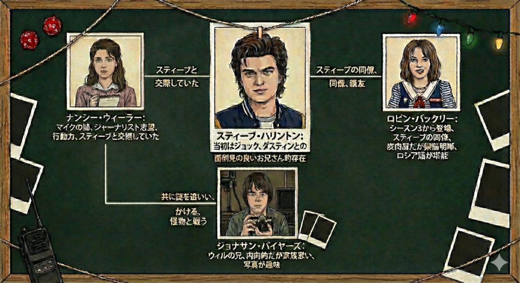 ナンシーと共に怪物と戦う。 - スティーブ・ハリントン: 当初は典型的な人気者(ジョック)だったが、ダスティンとの交流などを経て、面倒見の良いお兄さん的存在に成長する。