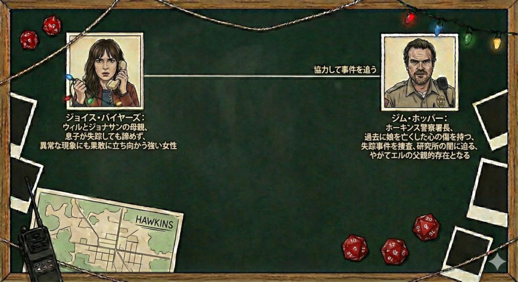 息子が失踪しても諦めず、異常な現象にも果敢に立ち向かう強い女性。 - ジム・ホッパー: ホーキンス警察署長。