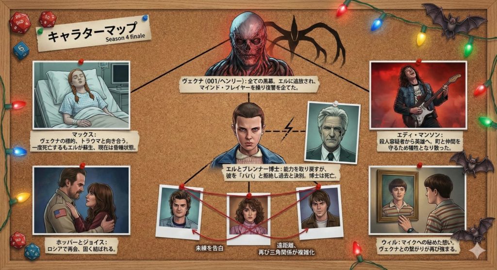 エルによって裏側の世界に追放され、マインド・フレイヤーを操り、ホーキンスへの復讐を企てていた。 - エルとブレンナー博士(パパ): エルは再び彼の下で能力を取り戻すが、最終的には彼を「パパ」ではなく「ブレンナー博士」として拒絶し、過去と決別します(ブレンナー博士は死亡)。