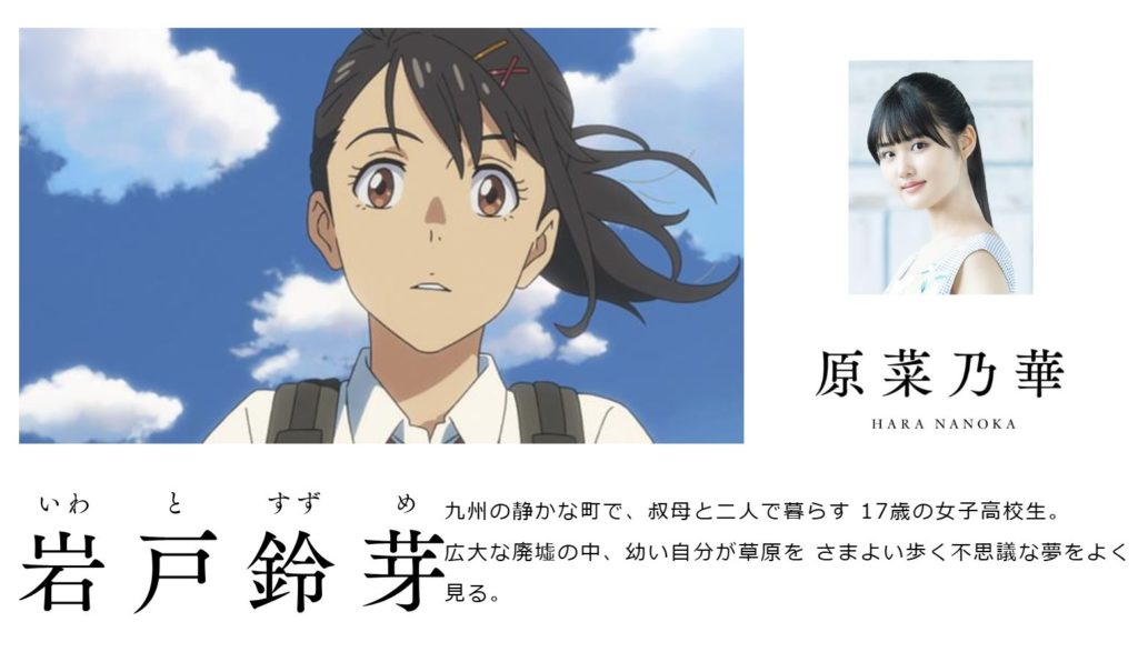 | 岩戸 鈴芽(いわと すずめ) | 原 菜乃華 | 主人公 | 災いを呼ぶ「後ろ戸」を閉める旅に出る高校生。 常世が見える。 |