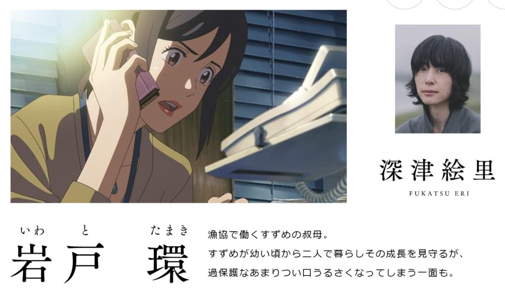 | 岩戸 環(いわと たまき) | 深津 絵里 | 叔母(育ての親) | 椿芽の妹。 すずめを引き取り、12年間育ててきた。 |