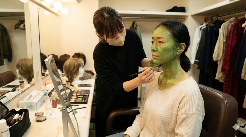 - 緑の肌のメイクは、特殊な化粧品と高度な技術によって美しく表現されている。