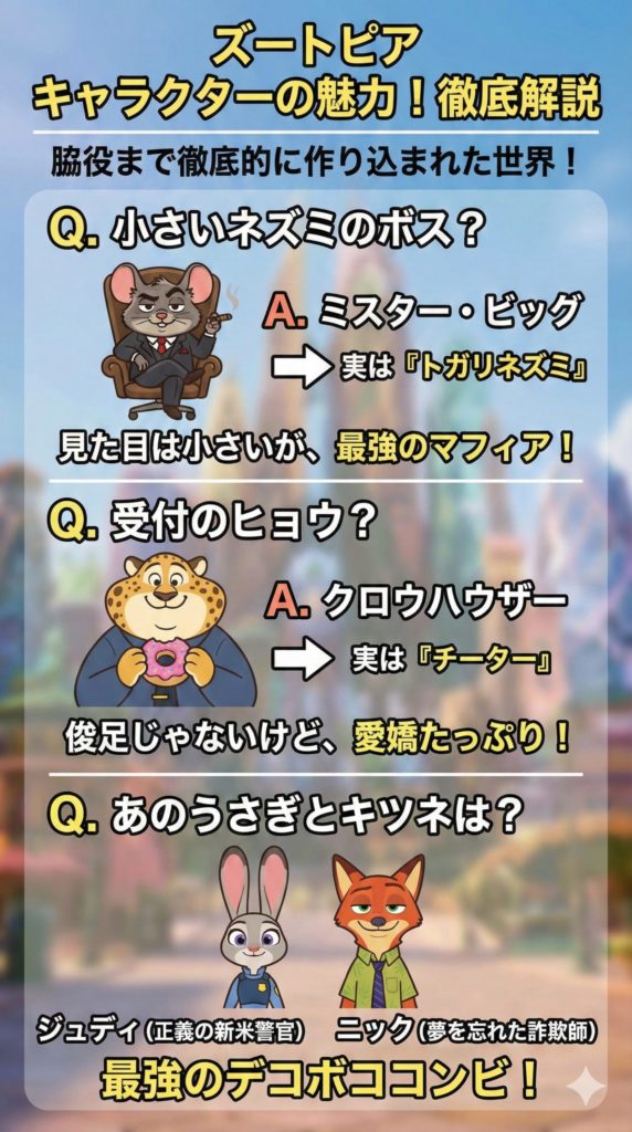 映画『ズートピア』は、ただの動物アニメーションではありません。緻密に計算された脚本、社会風刺、そして観客の心を掴んで離さない魅力的なキャラクターたち。