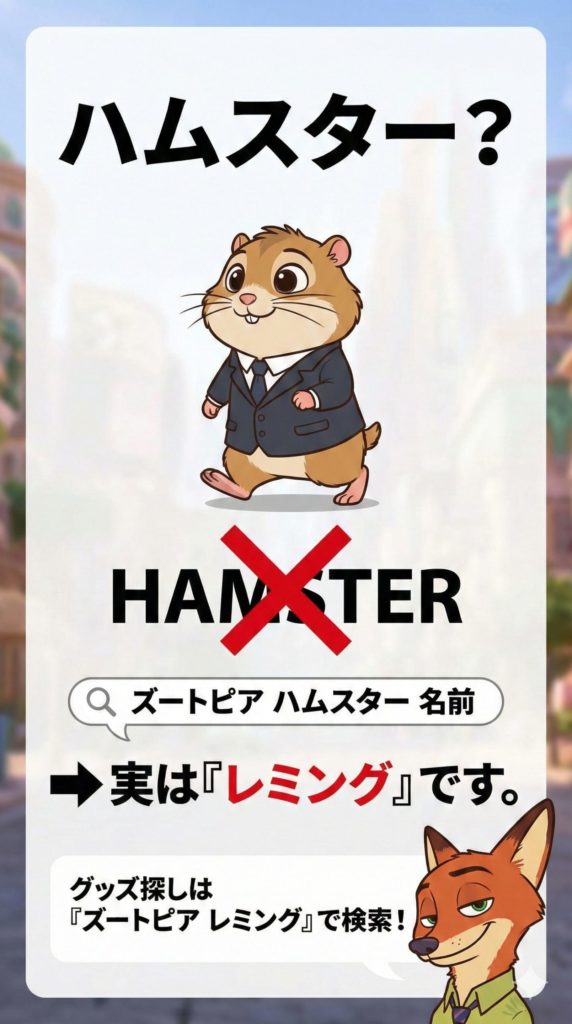 ですが、劇中でニック(キツネの詐欺師)は彼らのことを明確に「レミング」と呼んでいます。 もしあなたが「ハムスターのグッズが欲しい!」と思って探しているなら、キーワードを「レミング」に変えるだけで、お目当てのアイテムが見つかる可能性がぐっと上がりますよ。